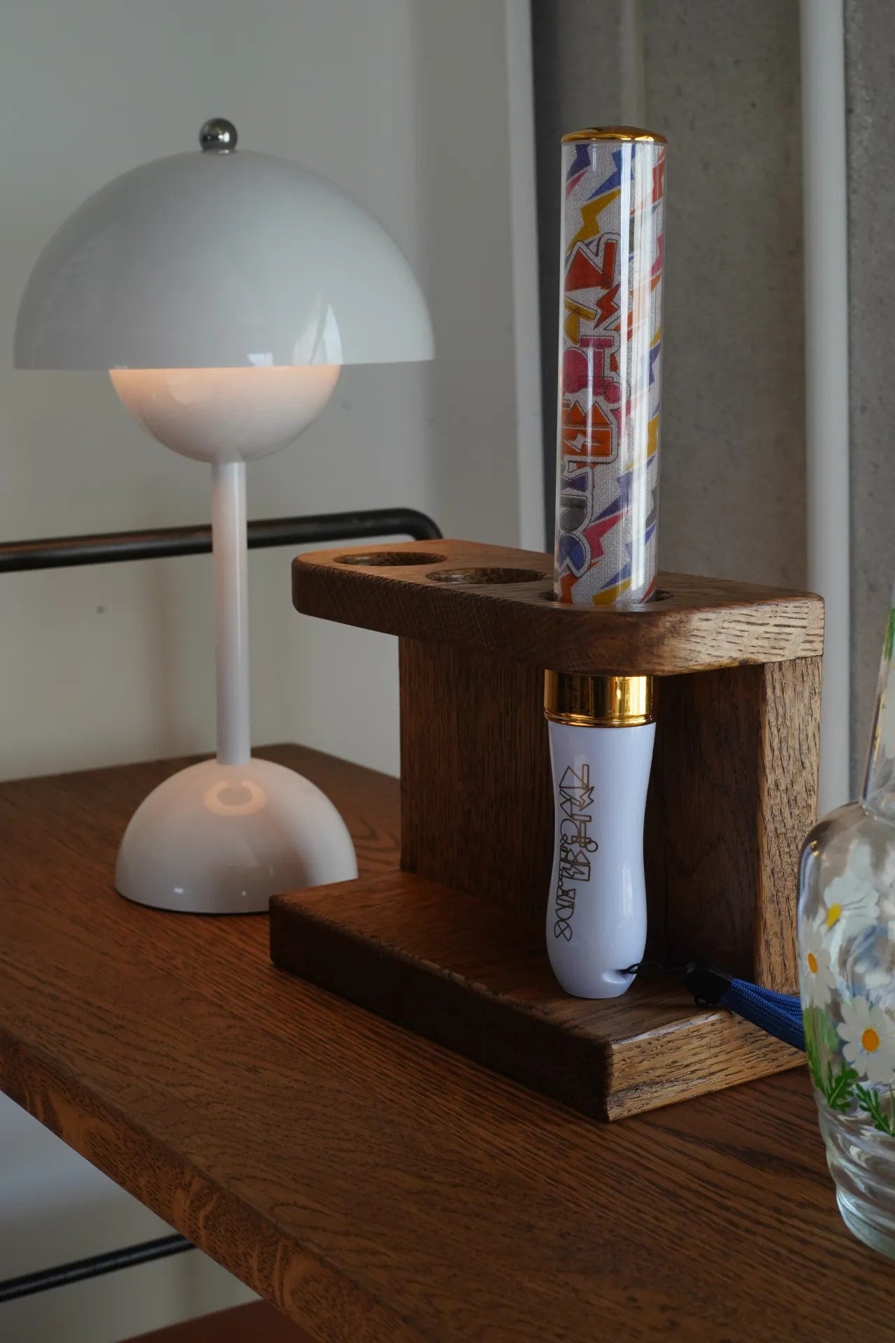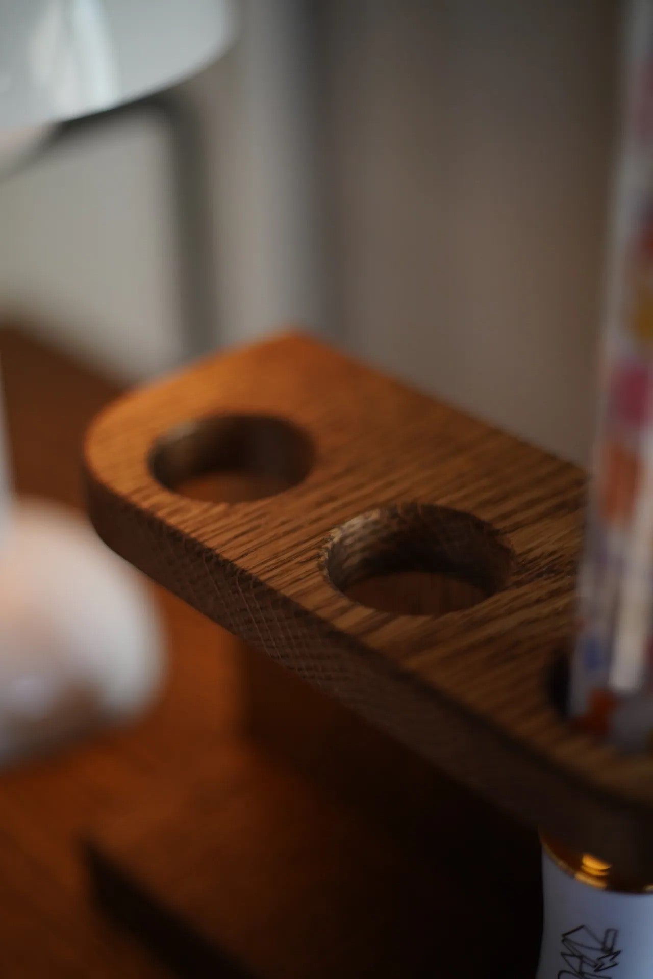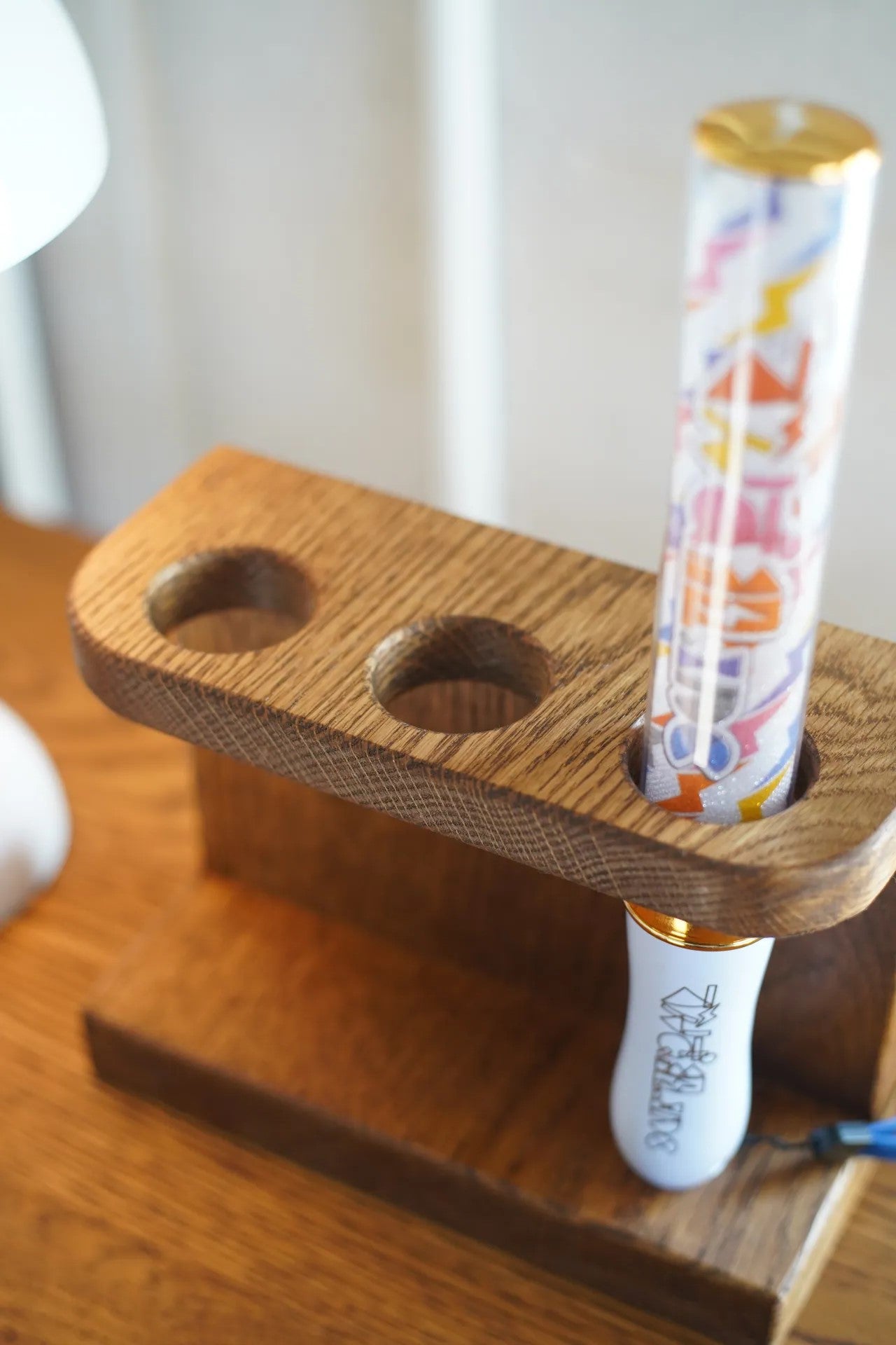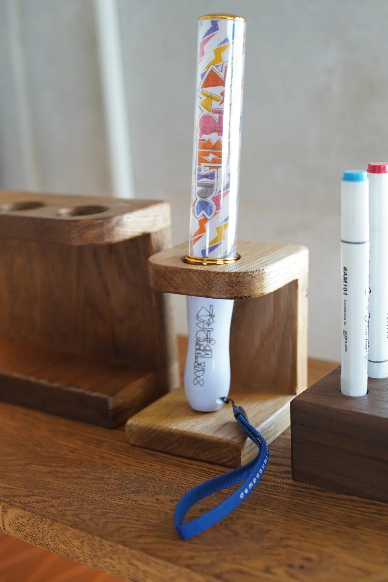 また、ペンライトの形状は千差万別。だからこそ、穴の径や台座の幅、連装数などのサイズオーダーにも対応できるようにしました。あなたの推しのペンライトに合わせて設えることができます。